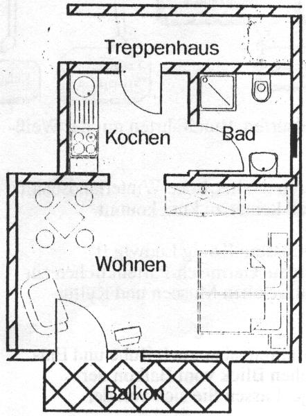 2 Erwachsene + 1 Kinder 32 qm, I Stock + 6qm Südbalkon Wohn-/Schlafraum, Küche Dusche/WC, Farb TV, Sat Antenne |